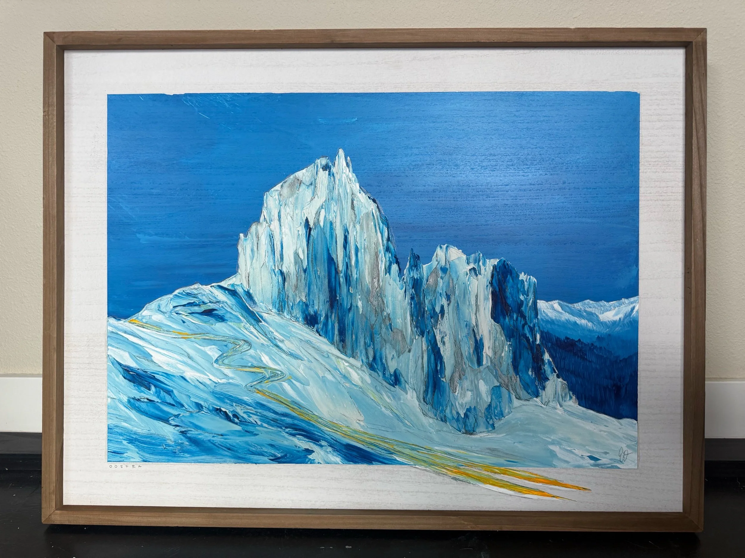 This framed mixed media original portrays Black Tusk in Whistler BC with bold texture, blue/orange/silver details, and tonal depth. | Dimensions: 27.95" H x 20.87" W x 1.2" | By PNW artist Erin Oostra.