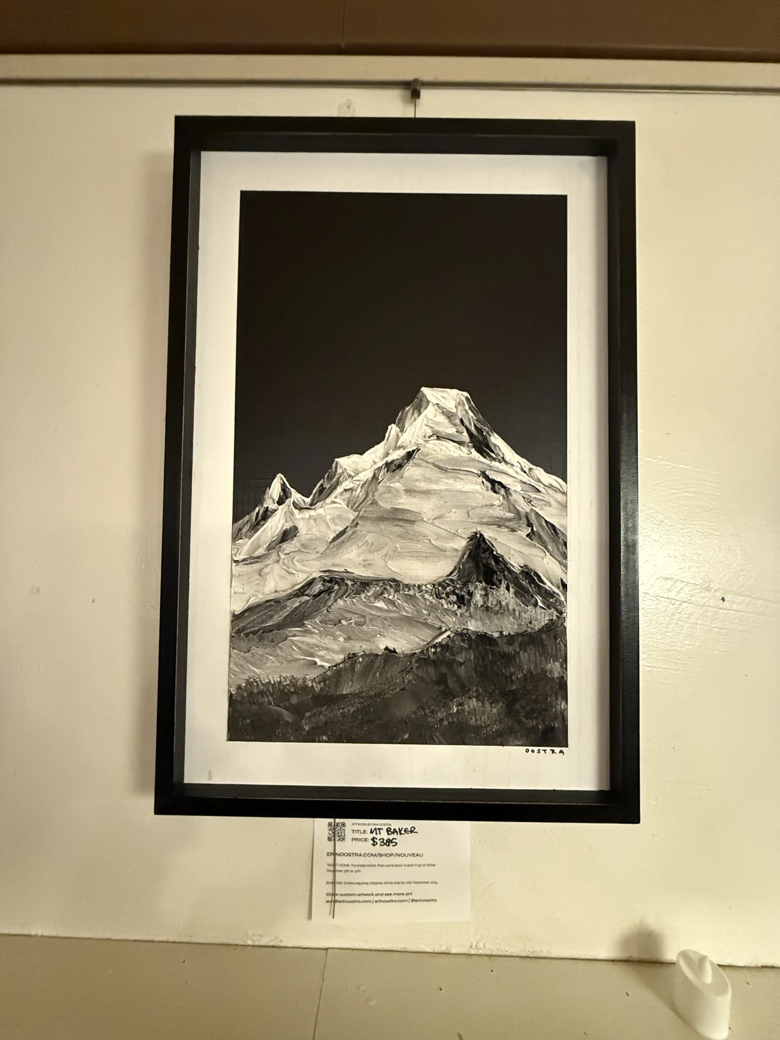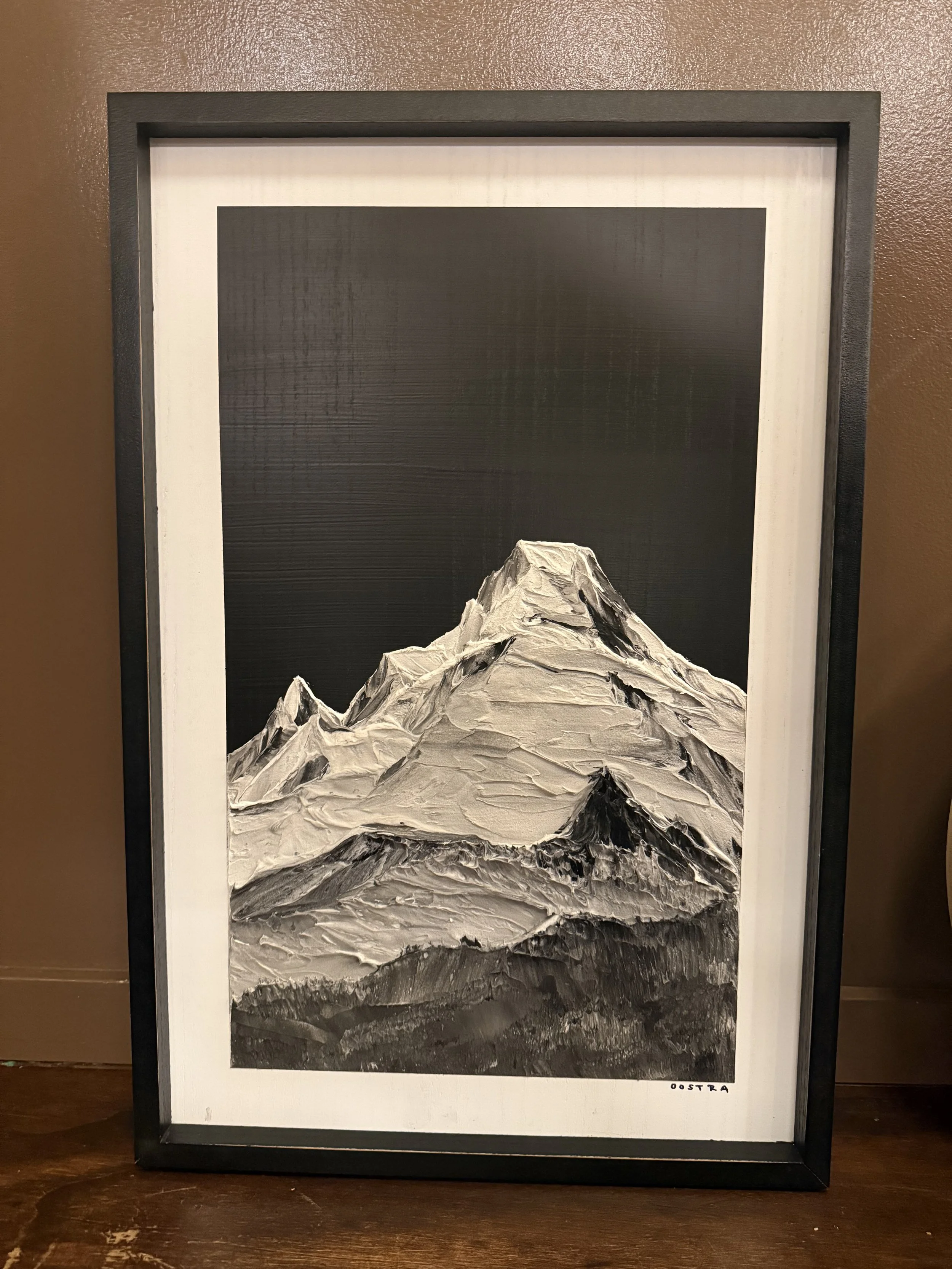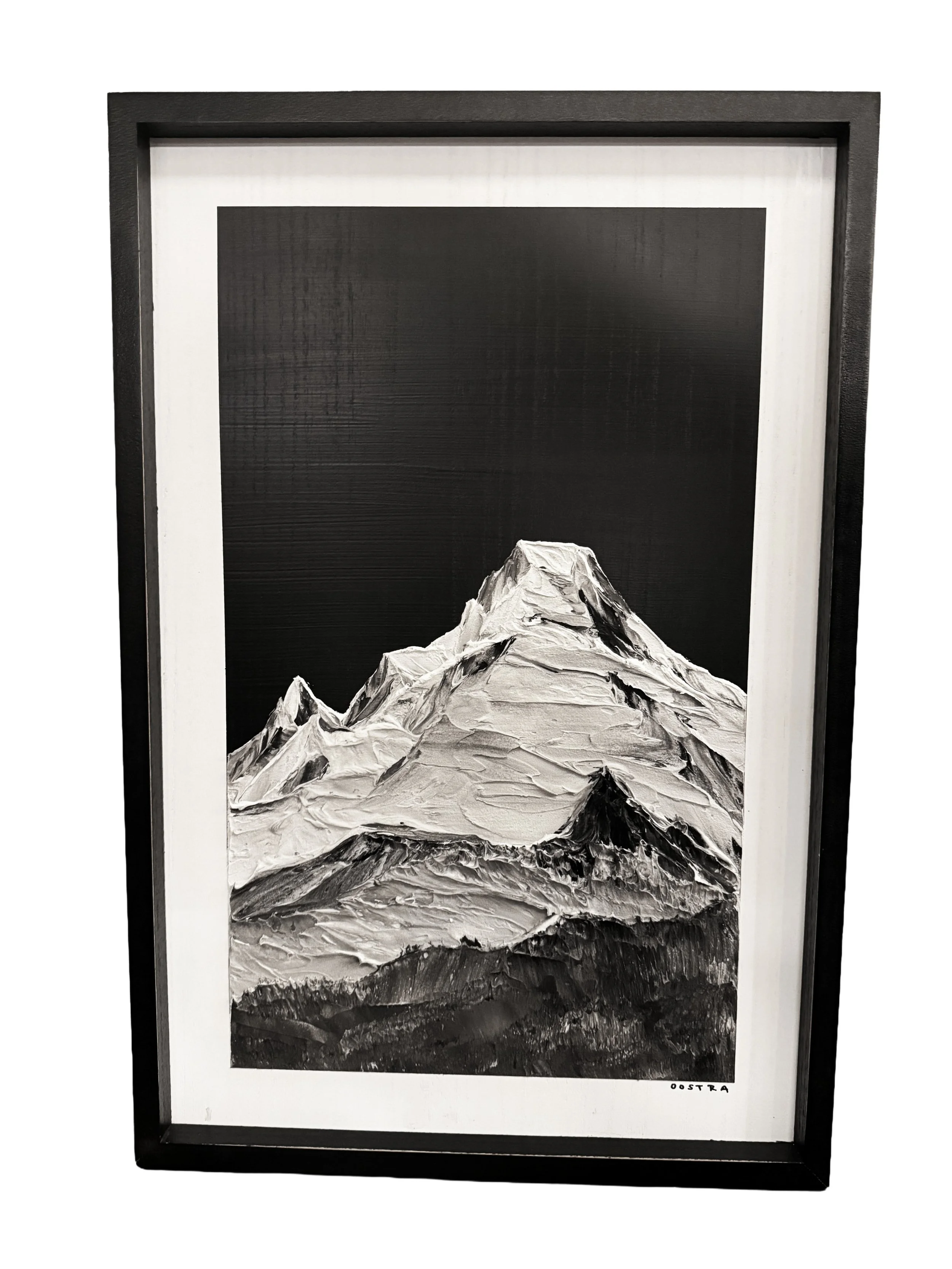 A framed original textured interpretation of Mt Shuksan. By PNW artist Erin Oostra.