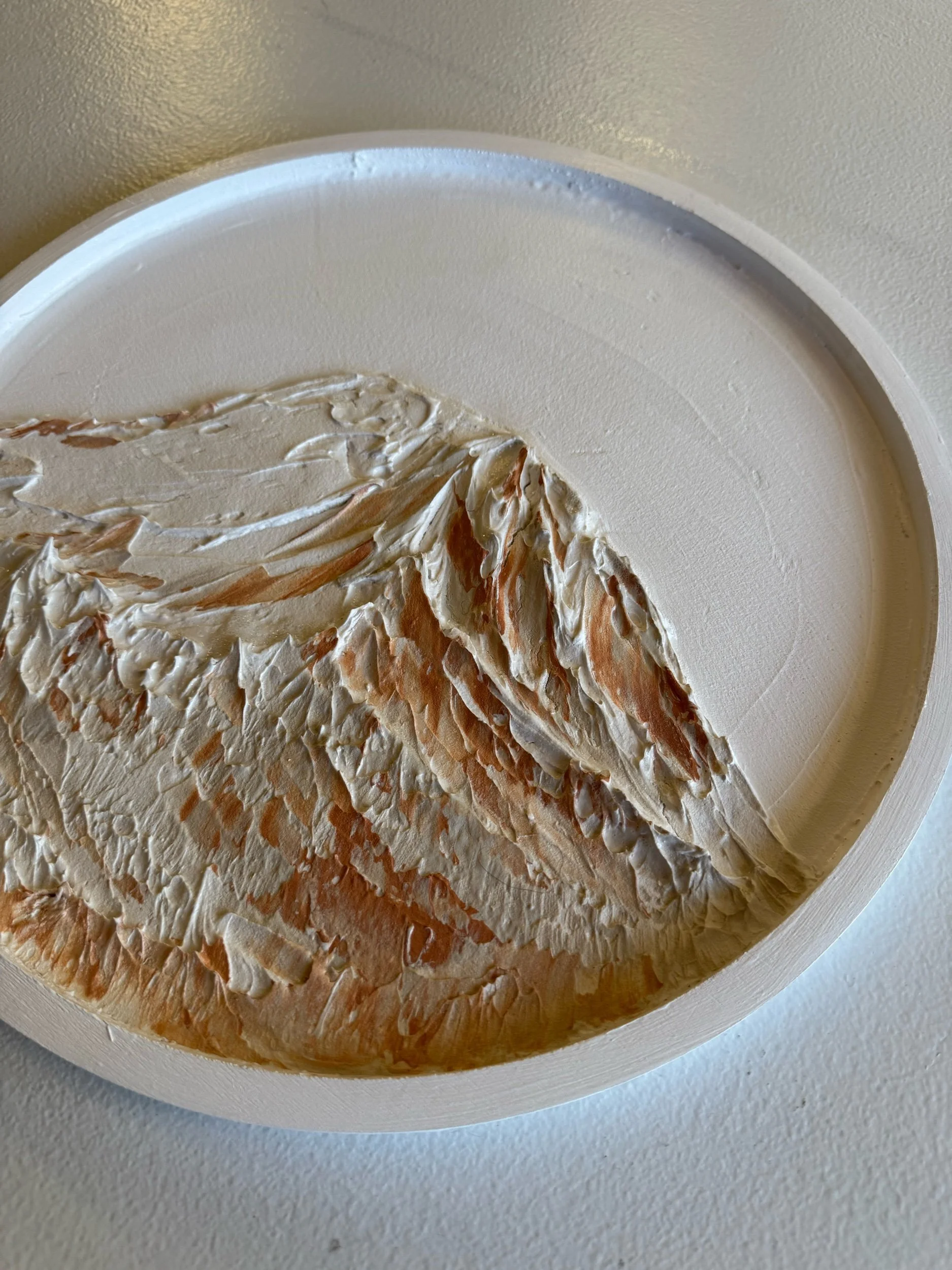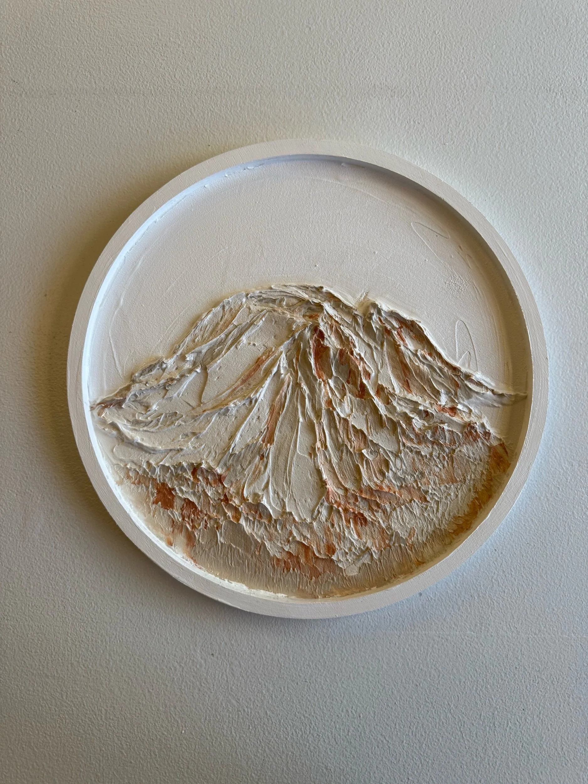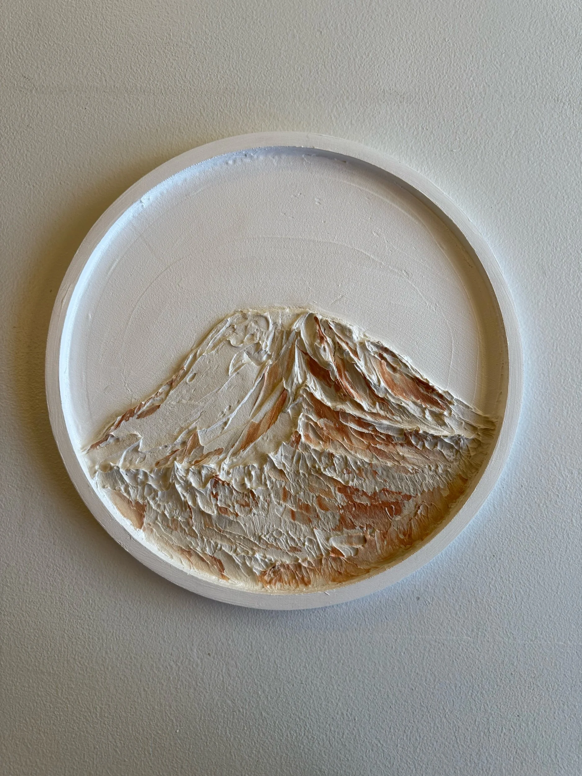 A framed 14” round original textured interpretation of Mount Rainier by PNW artist Erin Oostra.