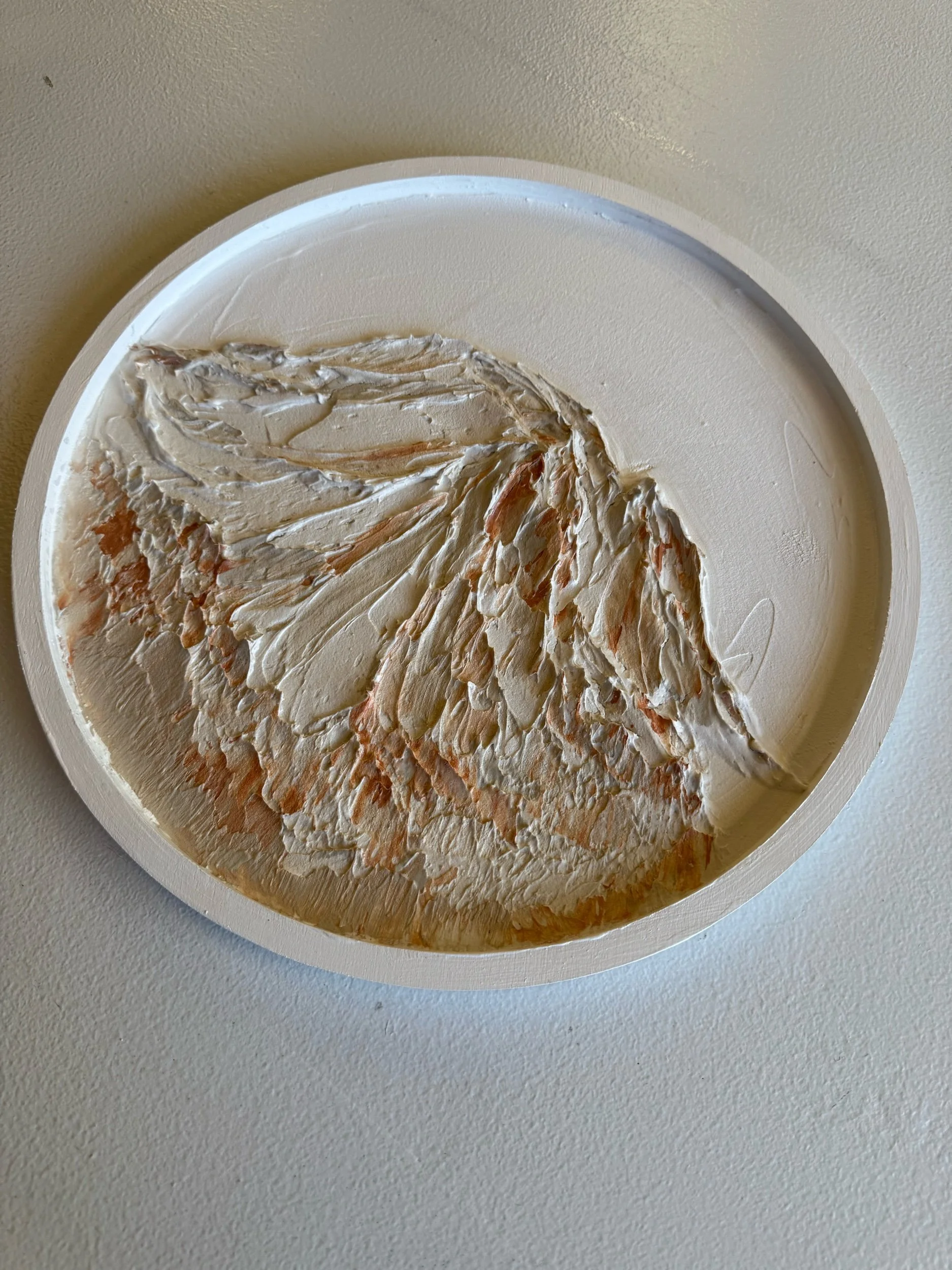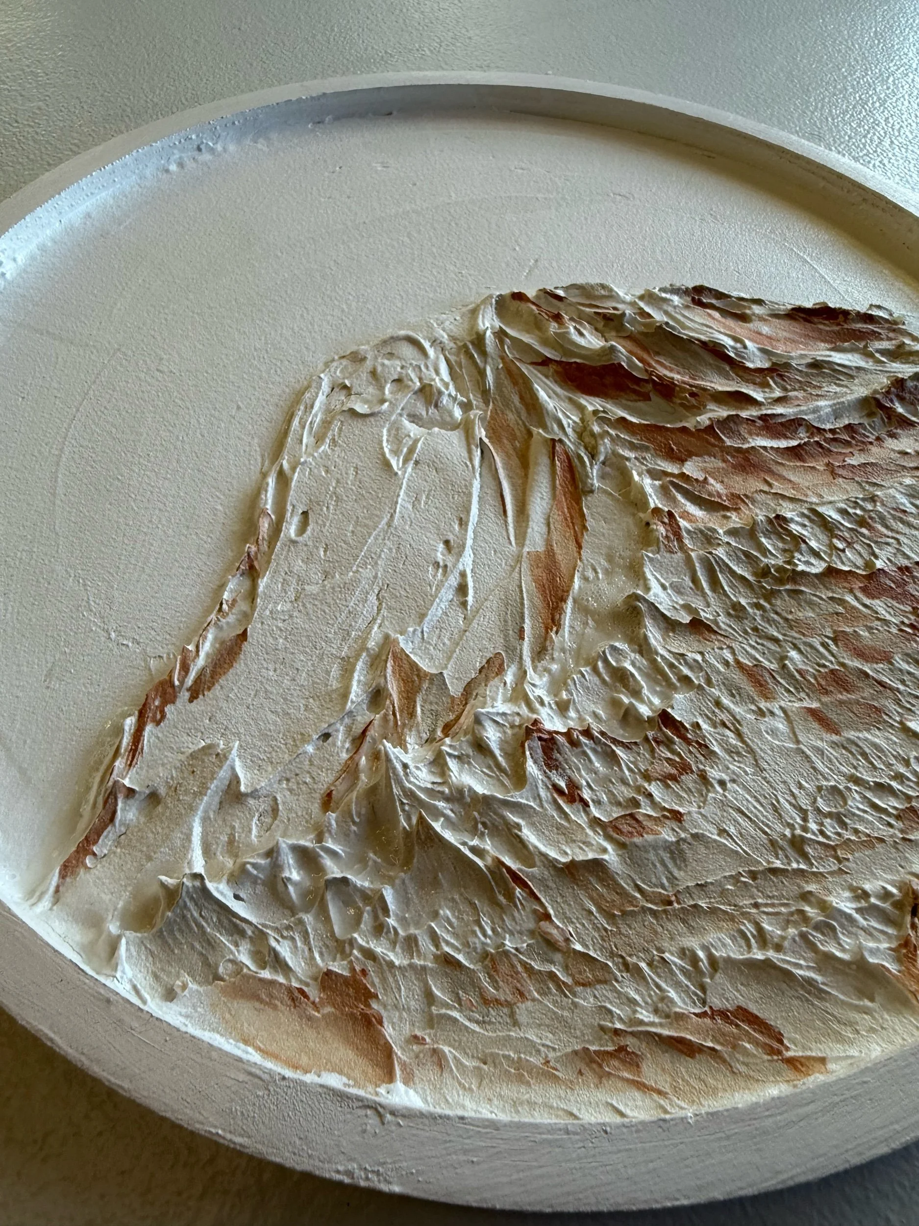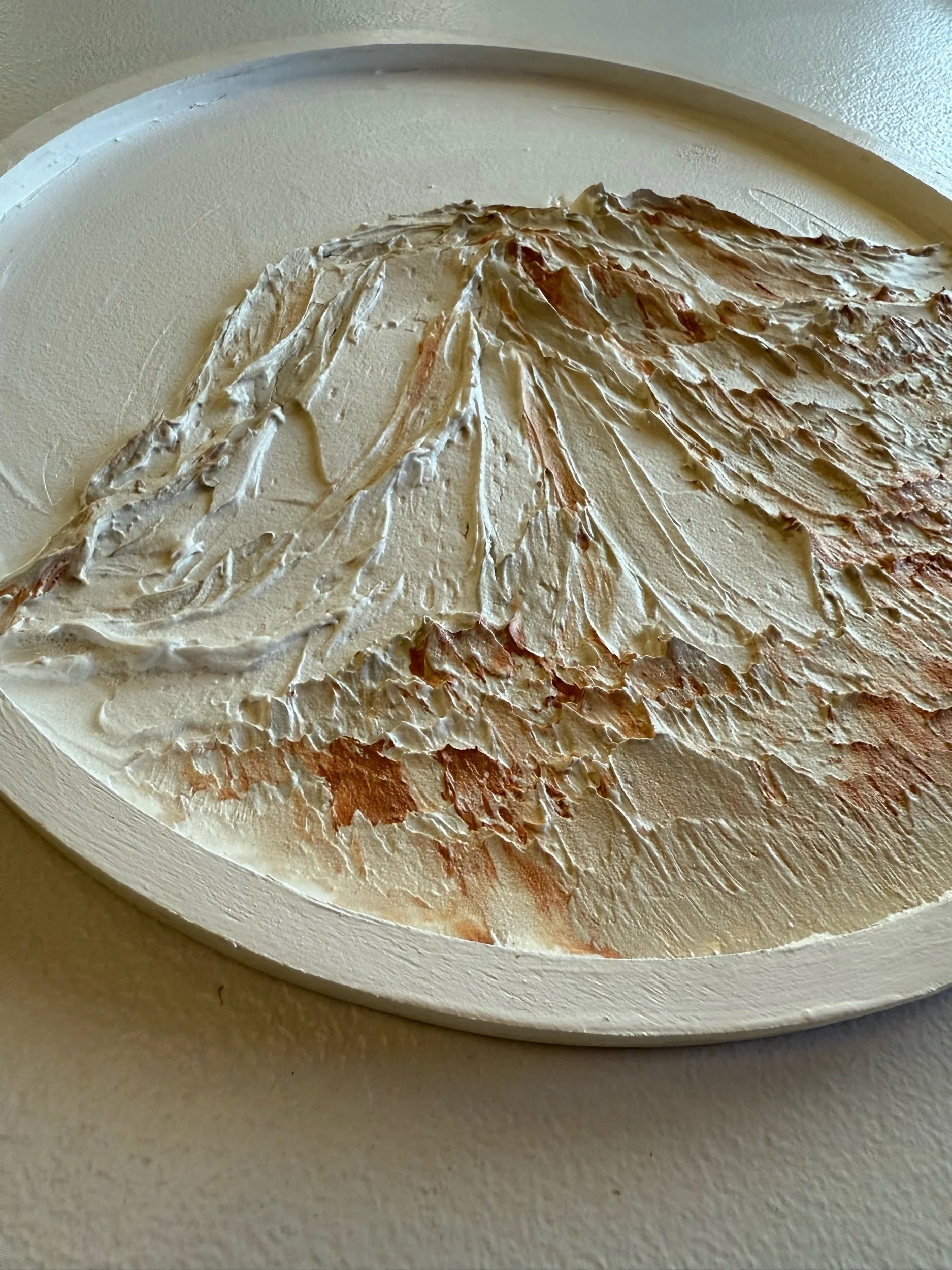 A framed 14” round original textured interpretation of Mount Rainier by PNW artist Erin Oostra.