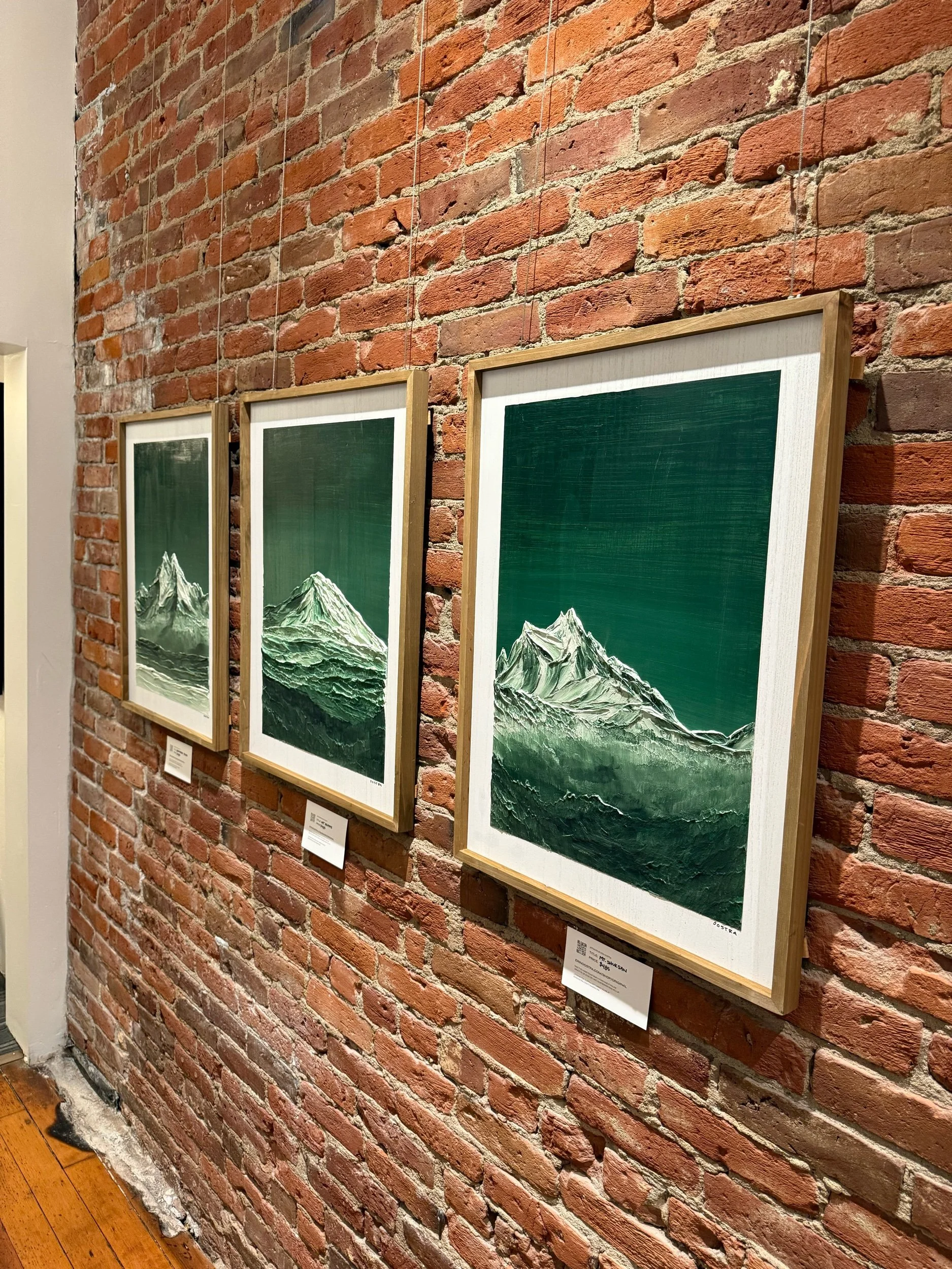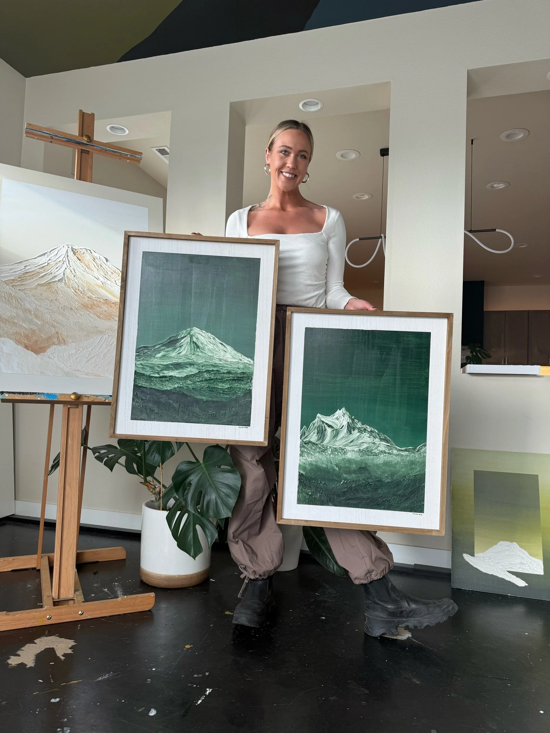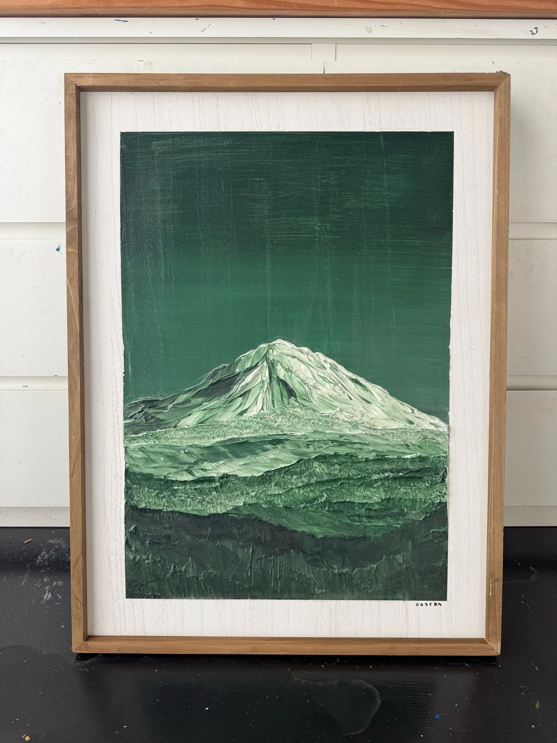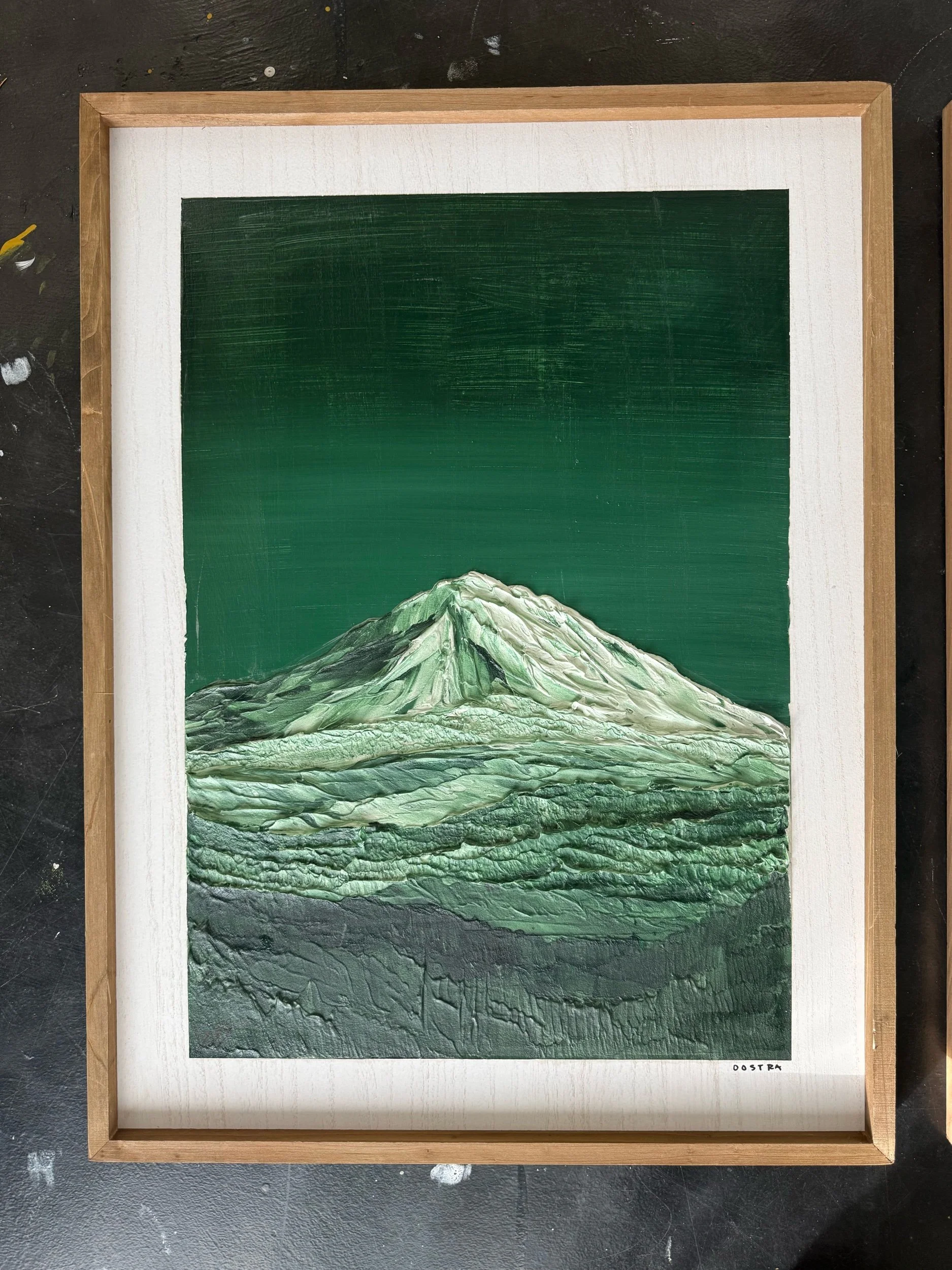 This framed green and white mixed media original portrays Mt. Adams with bold texture and tonal depth. By PNW artist Erin Oostra.