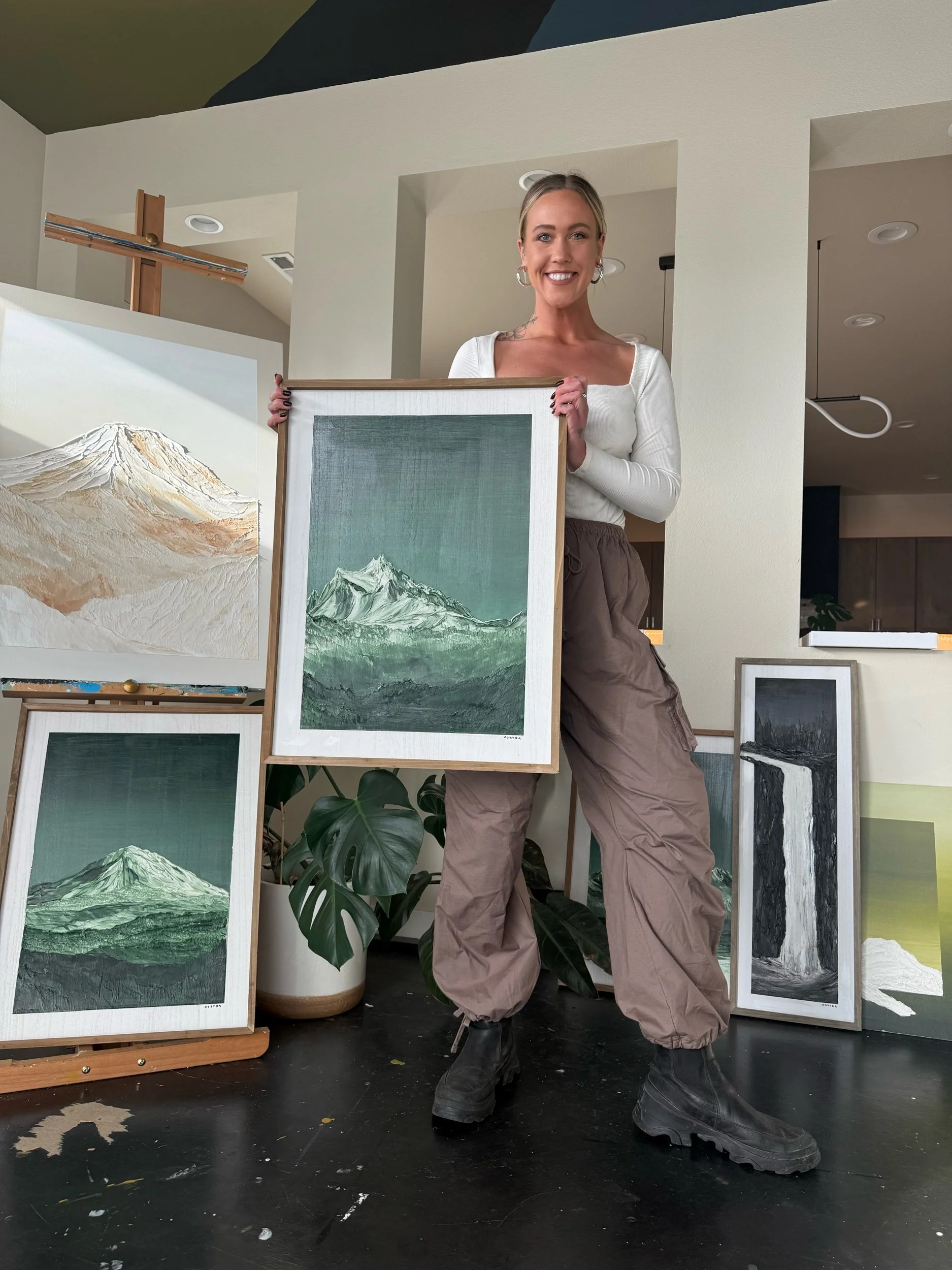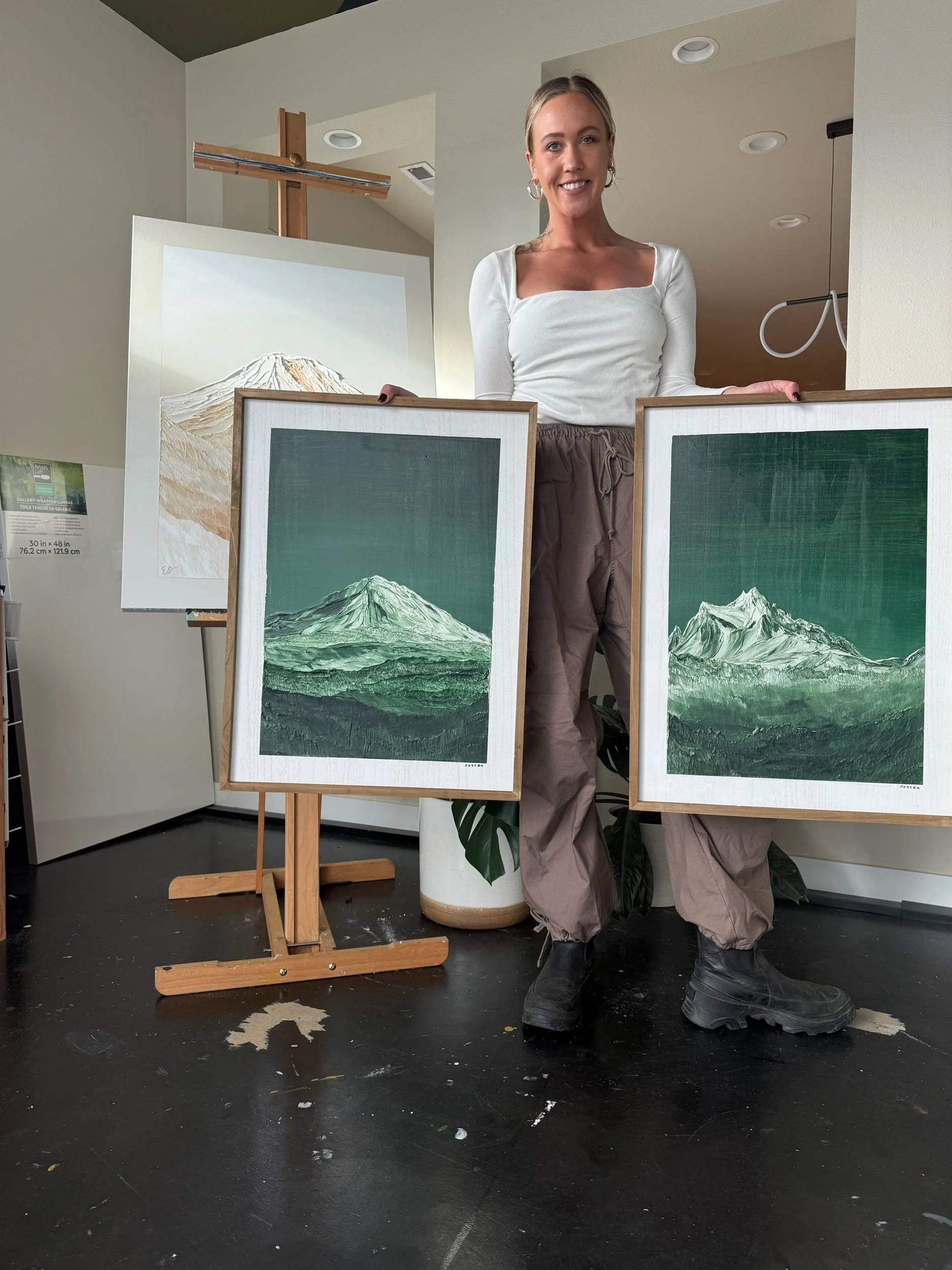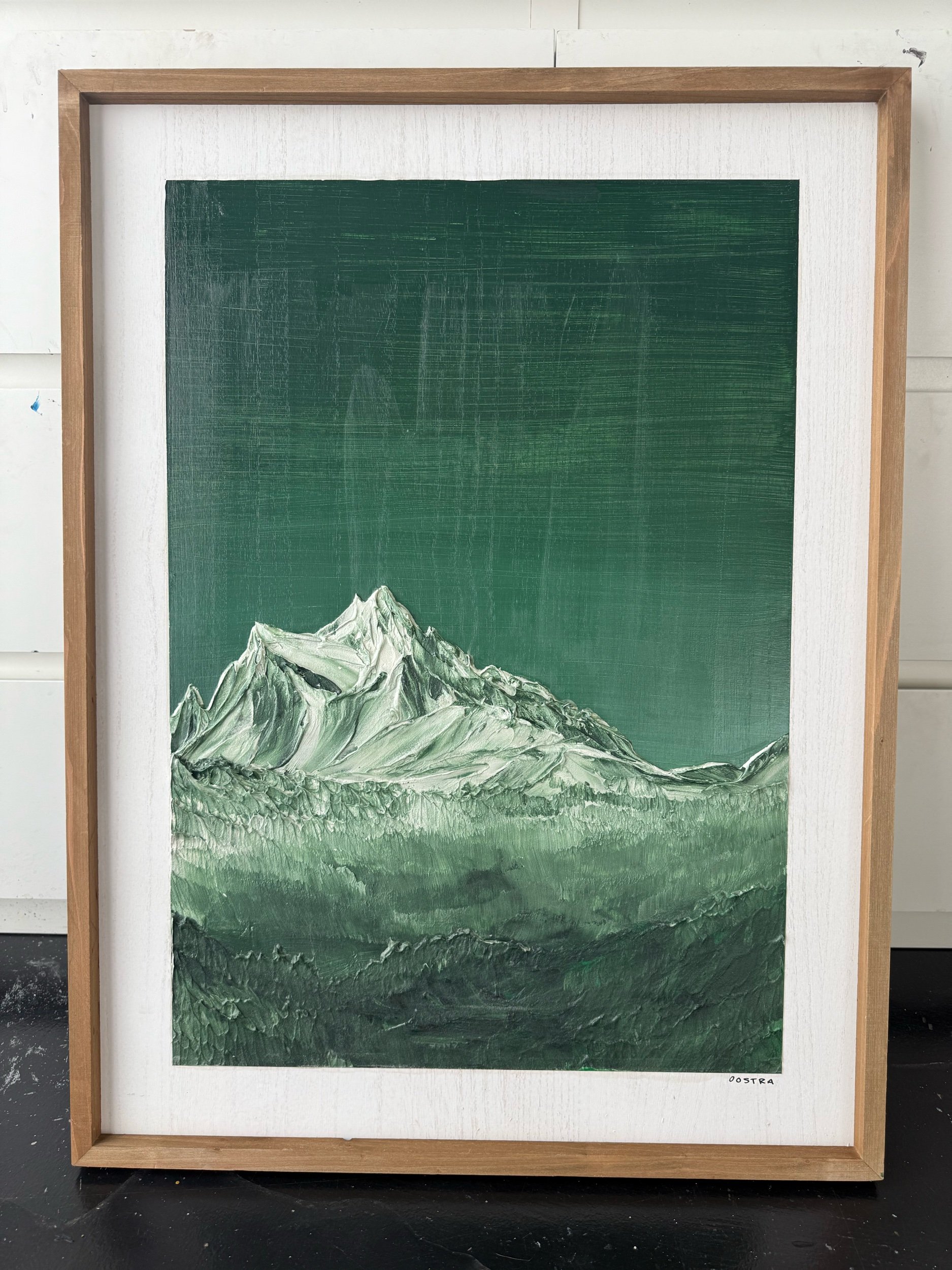 This framed green and white mixed media original portrays Mt. Shuksan with bold texture and tonal depth. By PNW artist Erin Oostra.