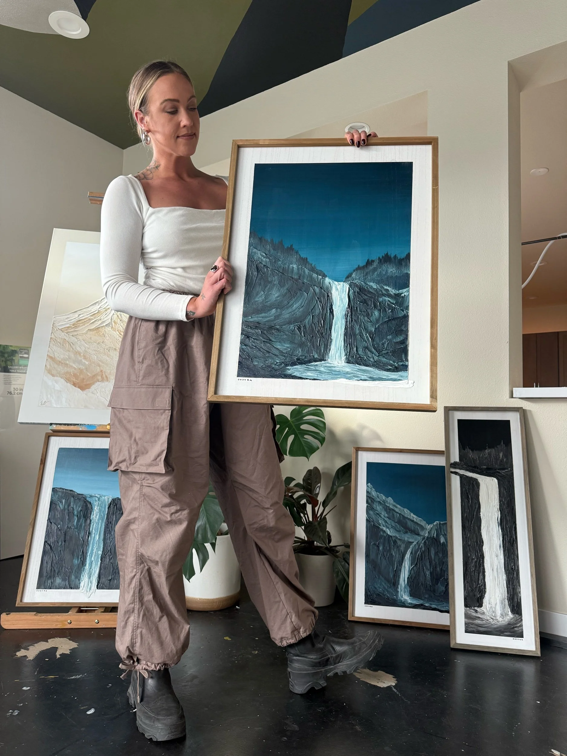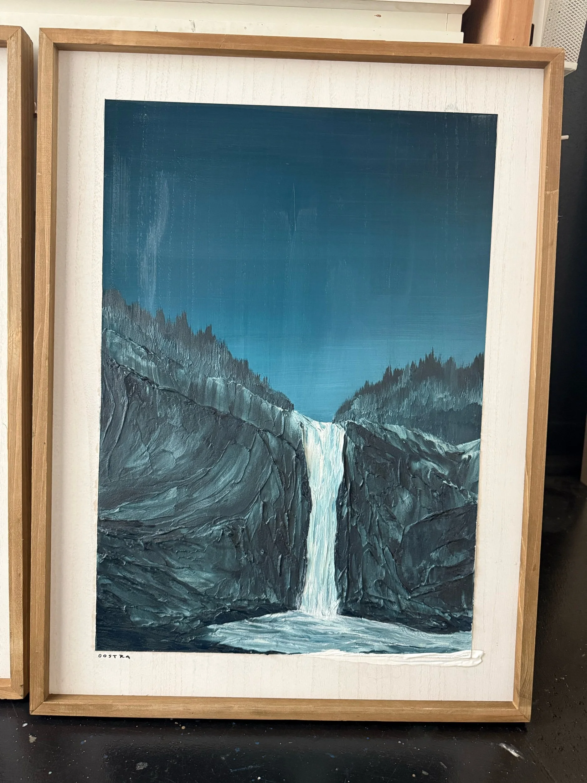 This framed blue-toned mixed media original portrays Oregon’s Salt Creek waterfall with bold texture and tonal depth. By PNW artist Erin Oostra.