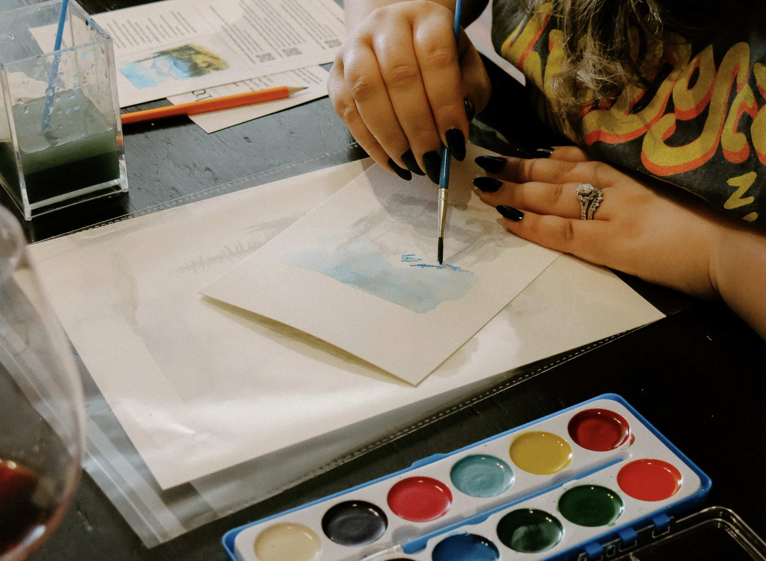 Erin provides everything you need to host a paint and sip watercolor class, including watercolor paper, brushes, paints, water containers, and table coverings. She handles the entire setup and cleanup process so you can focus on enjoying the event.